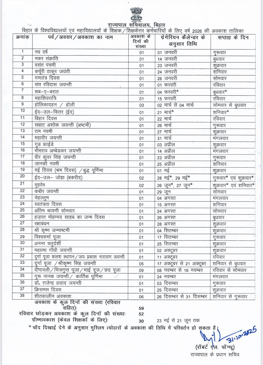 बिहार के विश्वविद्यालयों एवं महाविद्यालयों के शिक्षक / शिक्षकेत्तर कर्मचारियों के लिए वर्ष 2026 की अवकाश तालिका।
